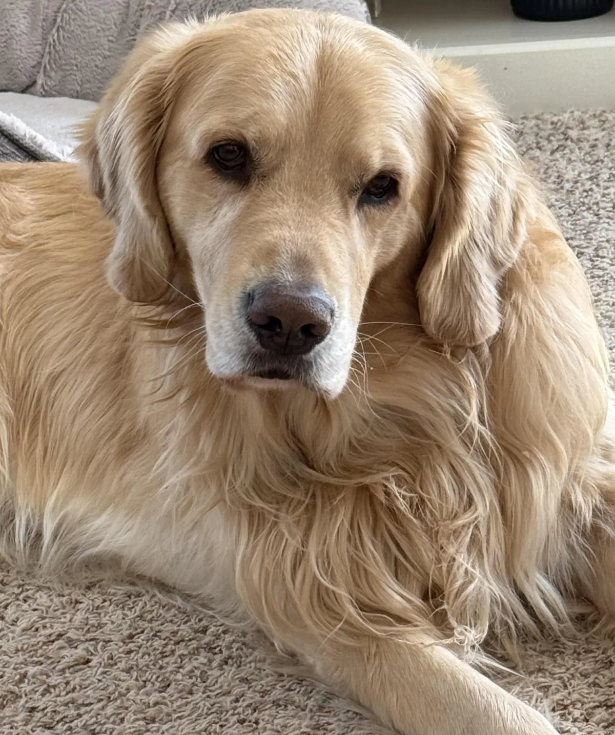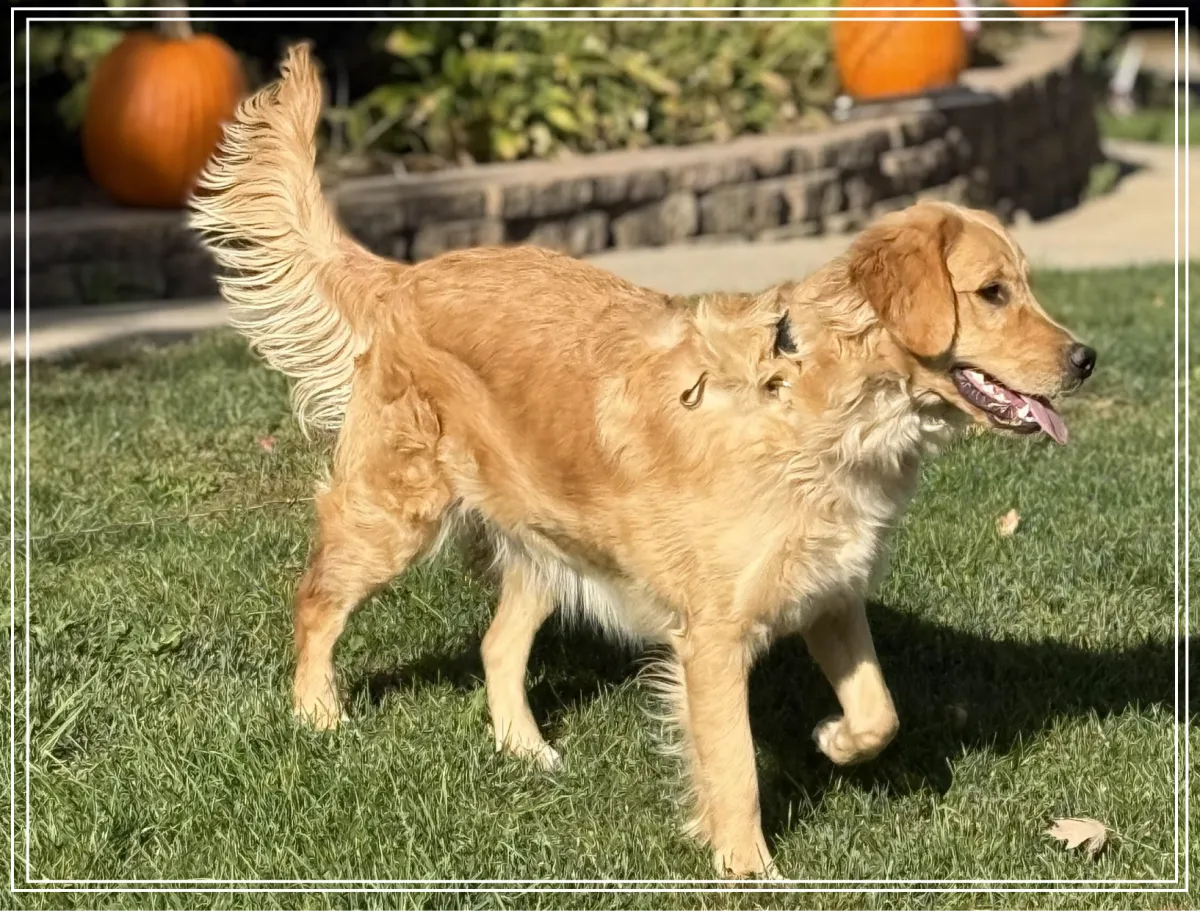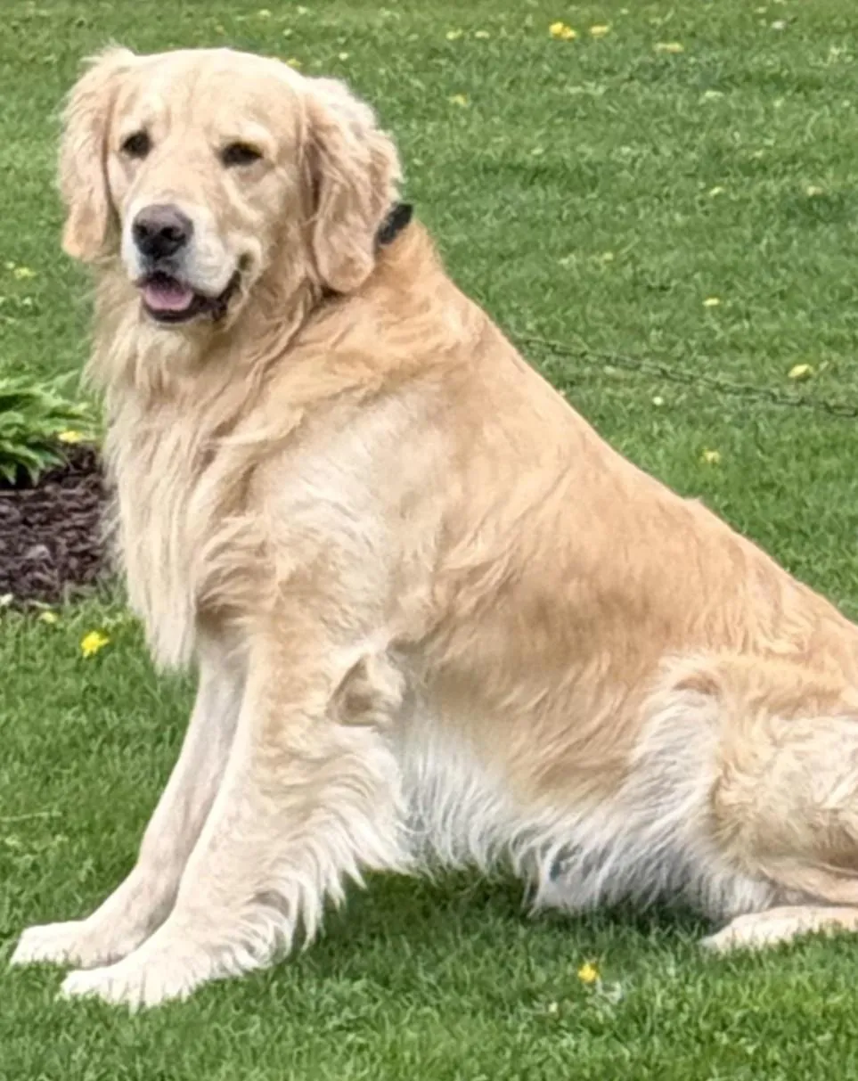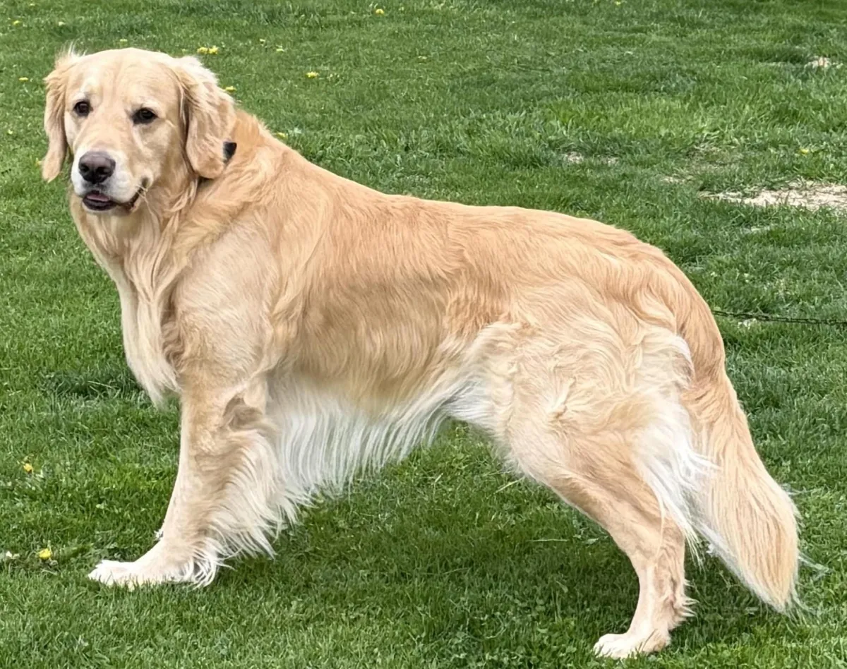 Benelli is our magnificent, Hearts of Gold, Golden Retriever boy with a gentle and loving temperament. He is a stunning Golden Retriever with champion bloodlines, showcasing his impressive heritage. Along with his wonderful personality, he's a handsome guy, featuring a lustrous golden coat and a big-boned, blocky head build. Click here to view Benelli's pedigree.