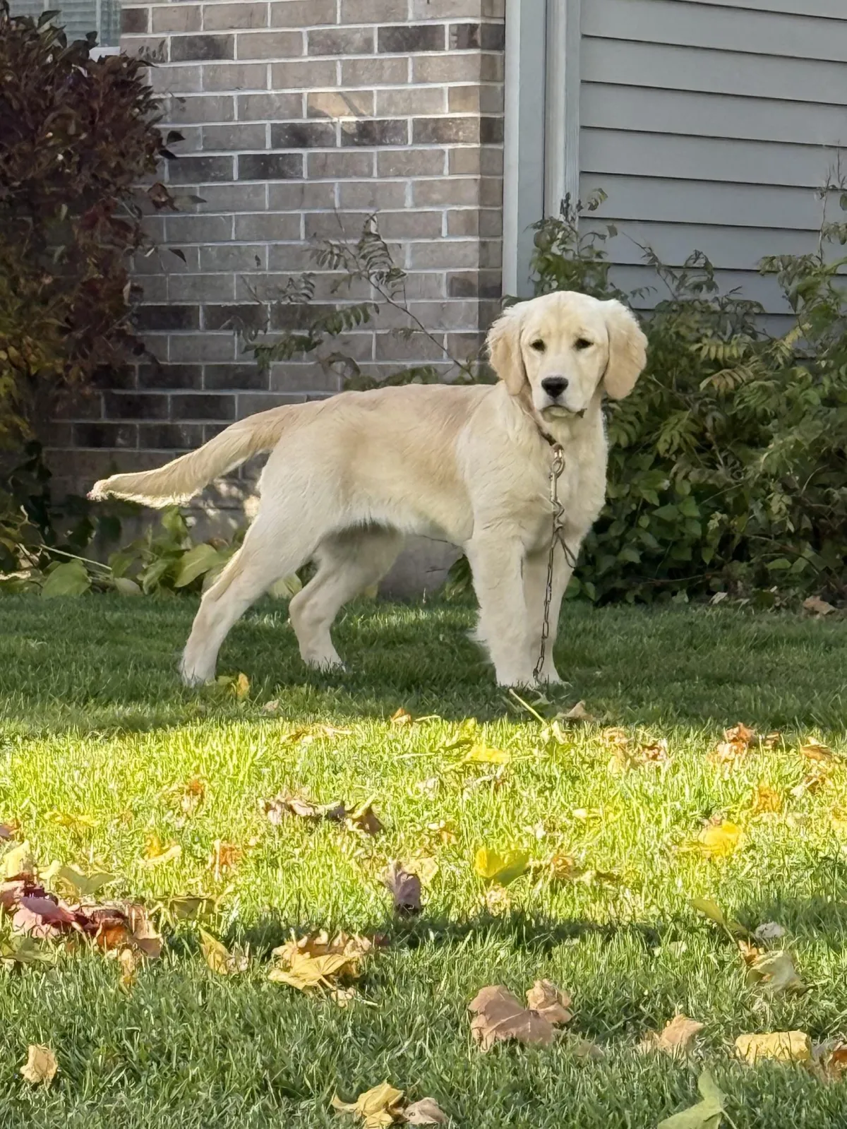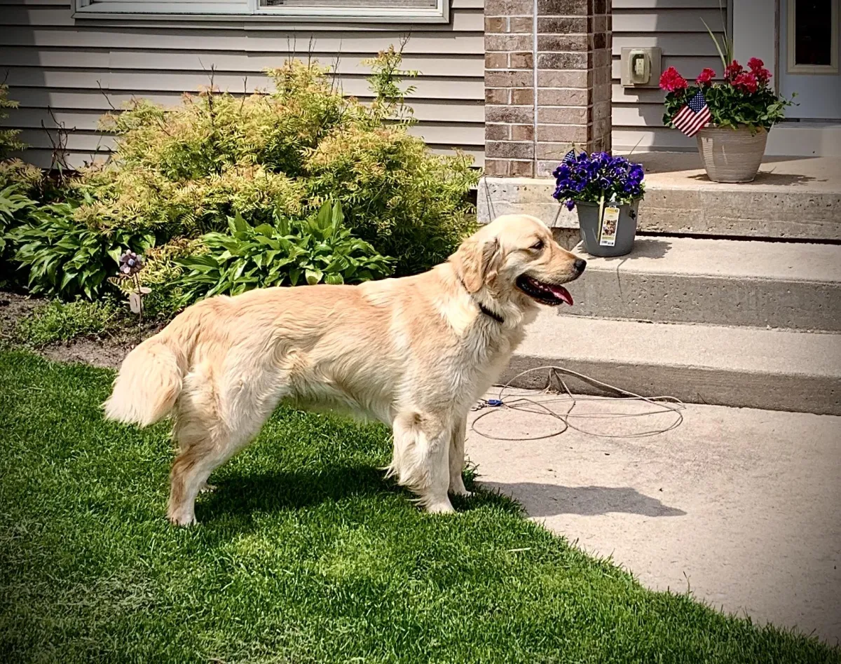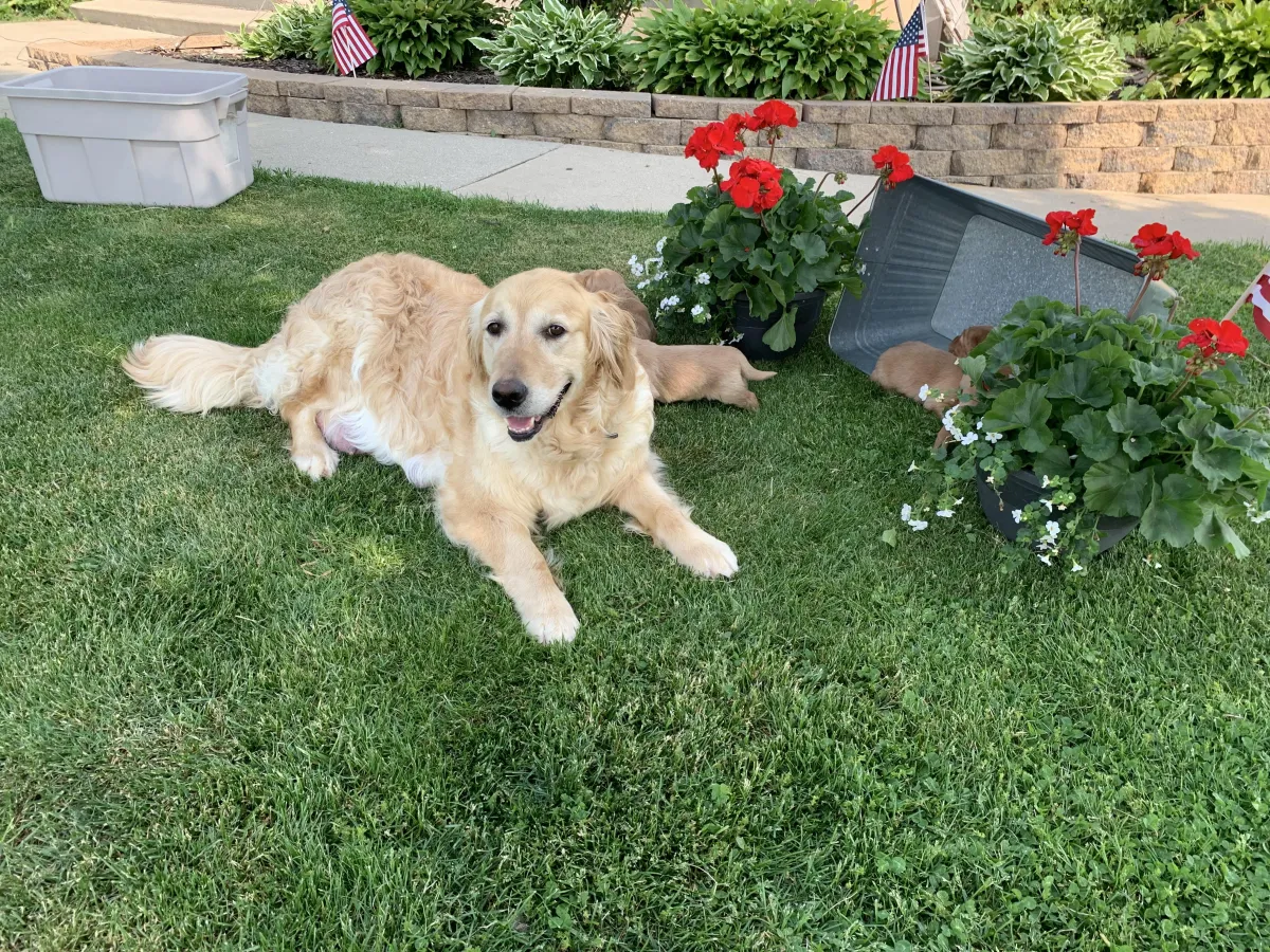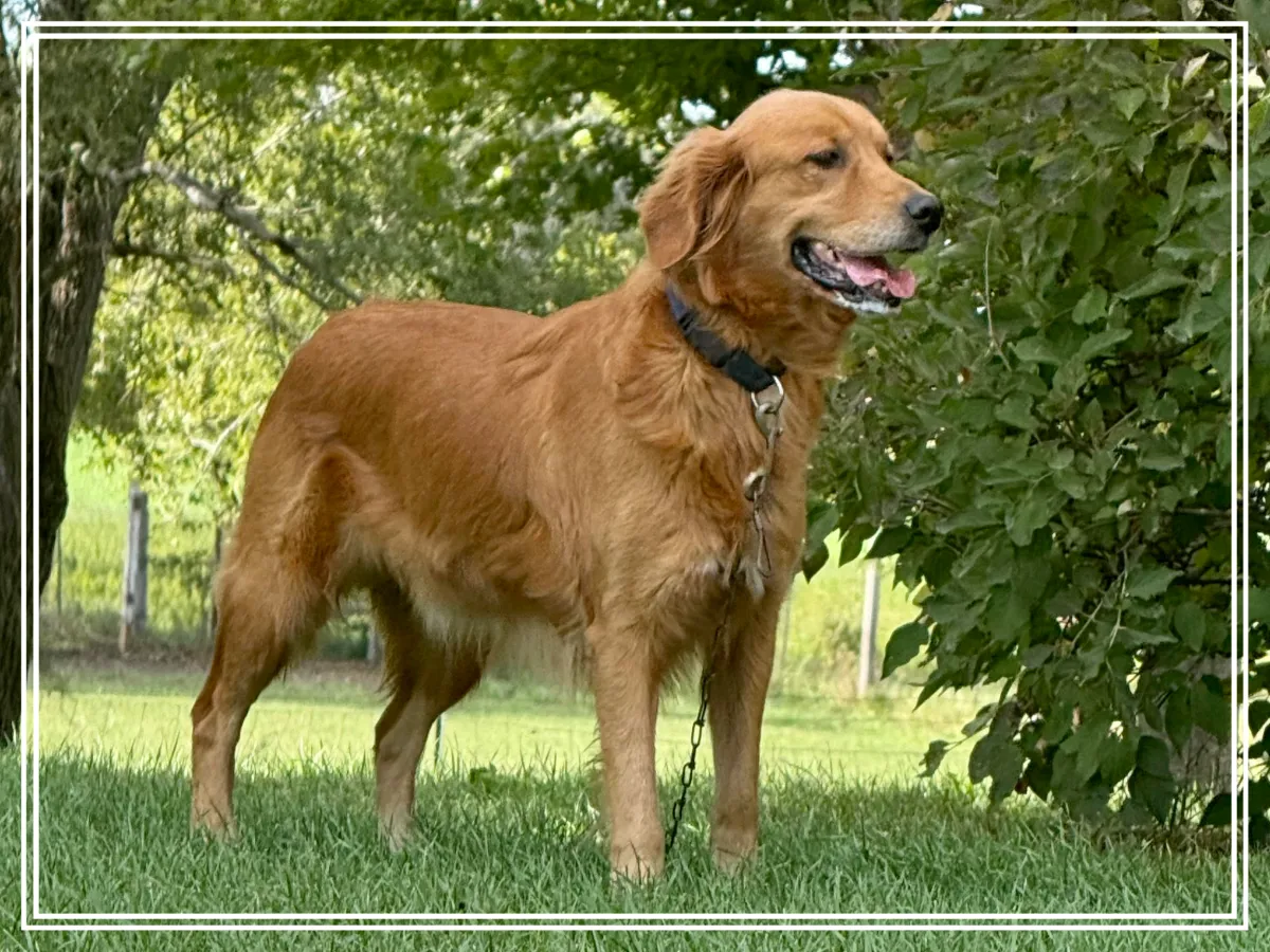 Hearts of Gold Reese is our splendid Golden Retriever female with a very gentle temperament. She is a remarkable fourth-generation star in our Hearts of Gold breeding program, showcasing her outstanding lineage with a touch more field lines. Along with her wonderful personality is her striking beauty, featuring a dark, sleek, straighter coat and a robust, athletic build—she absolutely loves the outdoors and a good game of fetch. Click here to view Reese's pedigree.